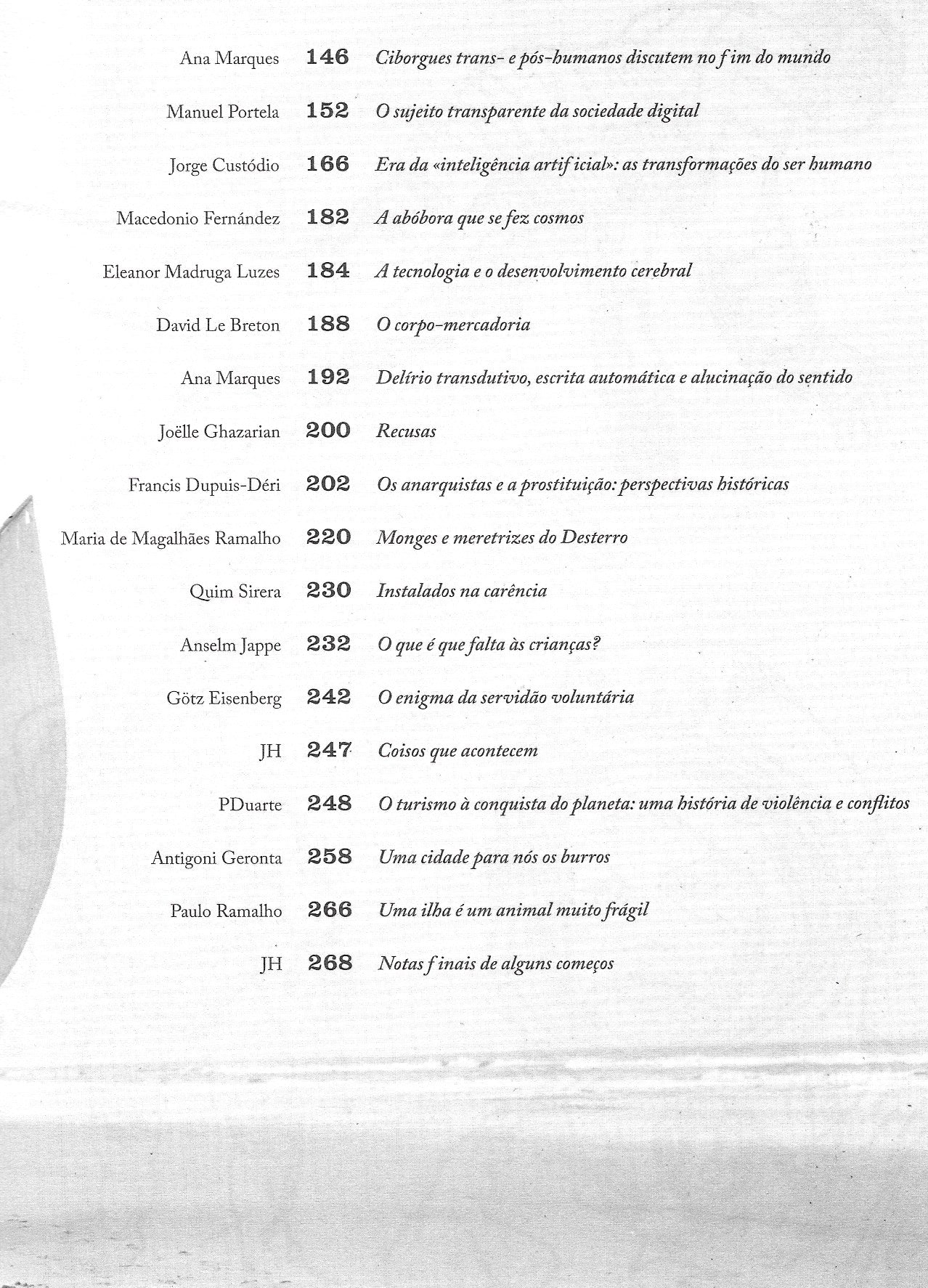 Ailton Krenak | Álvaro Fonseca | Álvaro Nogueira | Ana Marques | André Montanha | Anselm Jappe | Antigoni Geronta | Charles Reeve | Bruno Borges | Corsino Vela | David Le Breton | Eleanor Madruga Luzes | Emanuel Cameira | Fernando Gonçalves | Francis Dupuis-Déri | Gérard Lambert | Gerhard Haderer | Gonçalo Mota | Götz Eisenberg | Henry David Thoreau | Joëlle Ghazarian | Jorge Custódio | Jorge Leandro Rosa | José Miguel Gervásio | Kenneth White | Macedonio Fernández | Manuel Portela | Maria de Magalhães Ramalho | Miguel Carneiro | PDuarte | Paulo Barreiros | Paulo Ramalho | Phil Mailer | PMO | Quim Sirera | Rosa Gauditano | Sol Morgenstern